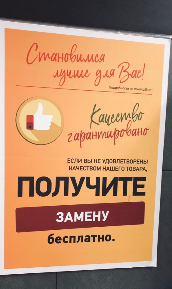 Пока мои читатели радуются наличию под боком Пятерочки и Магнита с их низкими ценами, скидками и акциями, я езжу в Ашан, а в обычный будний день заглядываю в Биллу. Я не считаю Биллу дешевым супермаркетом, даже если смотреть на цены собственной торговой марки. Однако не так давно я узнала про ее так называемые гарантии,и, конечно, спешу поделиться о них с вами. 1. Гарантия качества продукции Довольно странная гарантия, я ее не пробовала, и с трудом представляю ее реализацию на практике, однако она есть. Звучит она так - при неудовлетворении качеством продукции покупатель может получить аналогичную замену. Аналогичную замену - это значит в том же количестве, весе, стоимости, виде. Распространяется не на все товары. Не очень понимаю в данном случае слово "качество". То есть если мне печенье, условно говоря, не понравилось по вкусу, я могу получить такое же невкусное печение взамен? А если товар просрочен или испорчен - то это совсем другая история. Иными словами, данная гарантия каж