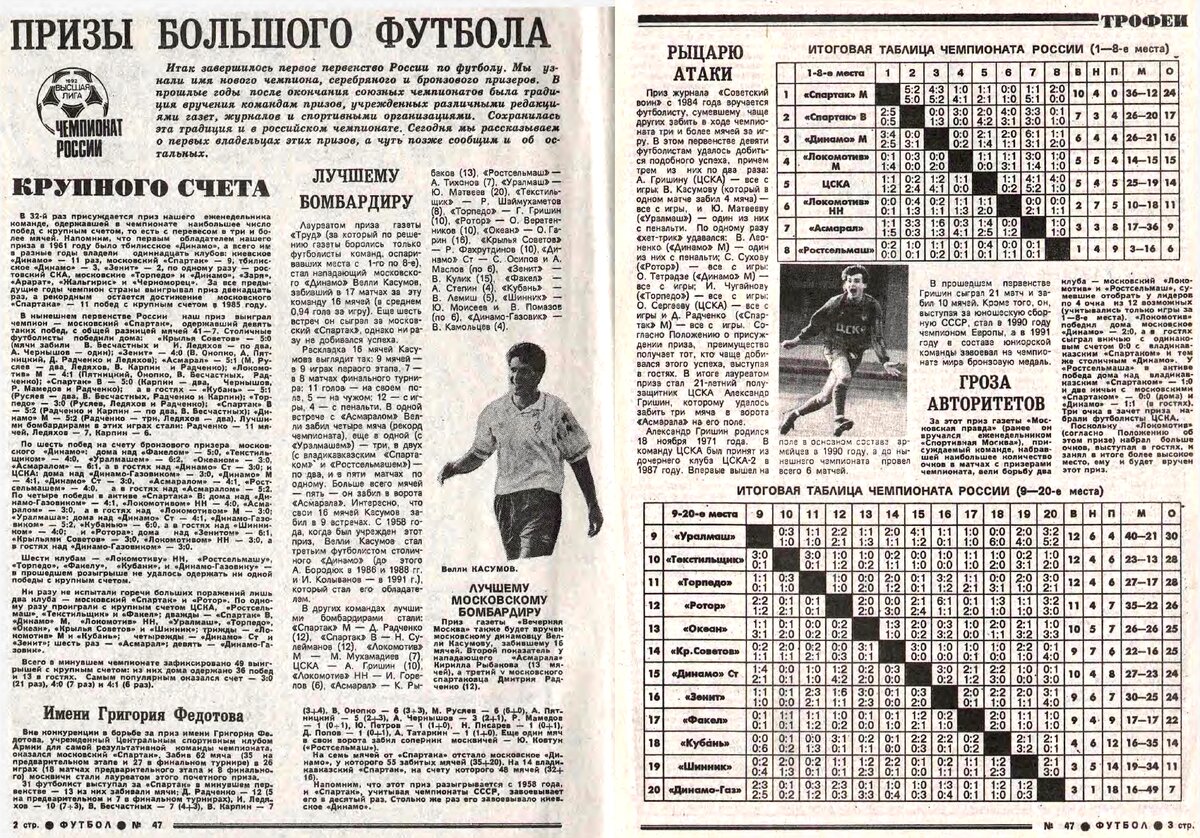 Всем привет! Продолжаем серию материалов о советских футбольных наградах, которые перестали вручать в России. Кому бы достался приз "Крупного счёта"? История приза Награда от еженедельника "Футбол" вручалась с 1961 года. Чаще всего в советской время она доставалась киевскому "Динамо" (11 раз), но за постсоветскую историю московский "Спартак" успел и догнать и перегнать "бело-голубых" (14 раз). Москвичам принадлежит и рекорд по количеству крупных побед в сезоне - в 1993 году они 14 раз громили оппонентов! Никому, кроме "Спартака" не удавалось добиваться двухзначного показателя, а у "красно-белых" таких сезонов было сразу 4! "Спартак" стал и последним владельцем трофея, получив его в 2006-ом. Много ли крупных побед в нынешнем сезоне? Тот случай, когда интригу долго не удержать, поскольку нынешний сезон в РПЛ всем запомнился как сезон бескомпромиссной борьбы, а значит доминирование одних команд над другими было сведено к минимуму. Тройку лидеров открывает питерский "Зенит, который лишь