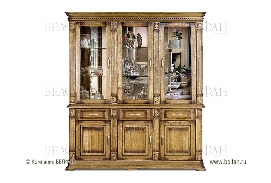 Витрина из дерева со стеклянными полками и дверцами всегда смотрится великолепно и богато. Она может иметь стеклянную заднюю стенку, и в ней будет отражаться старинный сервиз или хрусталь. В витрине можно выставить коллекционные вина и антиквариат.