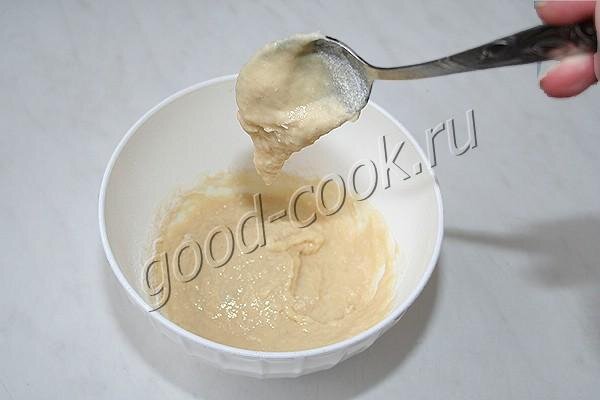 Должно получиться густое влажное тесто, без усилий мешающееся ложкой.