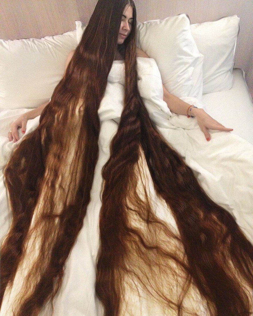 Наша сегодняшняя героиня - Алия Насырова. Девушка имеет невероятно длинные волосы. И как она сама заявляет - останавливаться на достигнутом она не собирается. Алие по праву принадлежит прозвище - Рапунцель. Вы только вдумайтесь. Длина волос девушки - более 2 метров; Вес - 2 килограмма "На мытьё головы уходит всего около 20 минут, а вот на сушку волос уходят уже целые сутки". Как признаётся сама девушка - её волосы даже имеют собственное место в их с мужем постели. Супруг же, в шутку называет её косу "третьим членом семьи". Алия надеется, что её пример вдохновит людей отращивать длинные и красивые волосы. Но не обязательно 20 лет:) Ставьте лайки, подписывайтесь на канал, отращивайте волосы (по желанию). Спасибо за внимание.