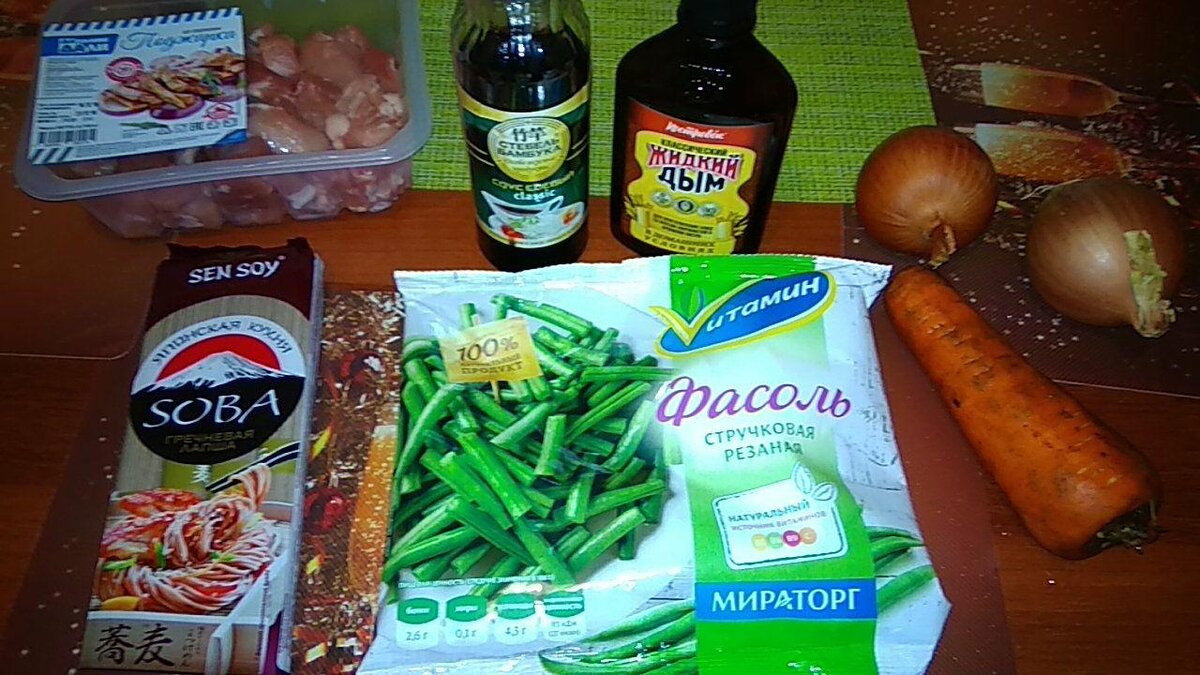 Ребзи, сегодня будем мутить "Вок" на воке😁 нам понадобится: мясо (это может быть свинина, говядина, филе курицы, в общем кому что по душе) - 0,7-1кг; лапша (у меня гречневая, так же лапша может быть любой на ваш вкус, яичная, фунчоза, лагманная, из под дошираков тоже канает👻😝) - 300-400гр; фасоль стручковая - 200гр; две крупных луковицы; крупная морковка; соевый соус; по возможности жидкий дым. Ах да, совсем забыл про кунжут, он придаст особой пикантности блюду. И так подготовили наши ингредиенты. Лук порезать полукольцами, морковь крупной соломкой, мясо мелкими кубиками посолили поперчили и отправили на быстрый огонь. Фасоль у нас уже нарезана из магазина. Мясо готовим до тех пор, пока не выпариться вся жидкость и кусочки слегка поджарятся Теперь добавляем примерно 50мл соевого соуса и столовую ложку жидкого дыма. Снова ждём пока выпарится жидкость (Разумеется постоянно перемешиваем все лопаткой). Пришла очередь морковки и фасоли. Через пару минут добавляем лук Когда лук приобре