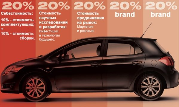 Дело в том, что цена на автомобиль складывается из того, сколько готов за него заплатить покупатель. Поэтому подсчитать долю бренда в цене автомобиля можно лишь после того, как автомобиль будет продан. А для этого необходимо вычесть все пункты затрат (разработка, исследования, реклама), вычесть брак, заложить заводскую гарантию и …разделить на конкретное количество проданных машин. Ну а поскольку разные модели имеют разный успех и по-разному продаются, то доля бренда в стоимости автомобиля – это не постоянная, а «плавающая» величина. Её можно назвать лишь обобщённо, в процентах.