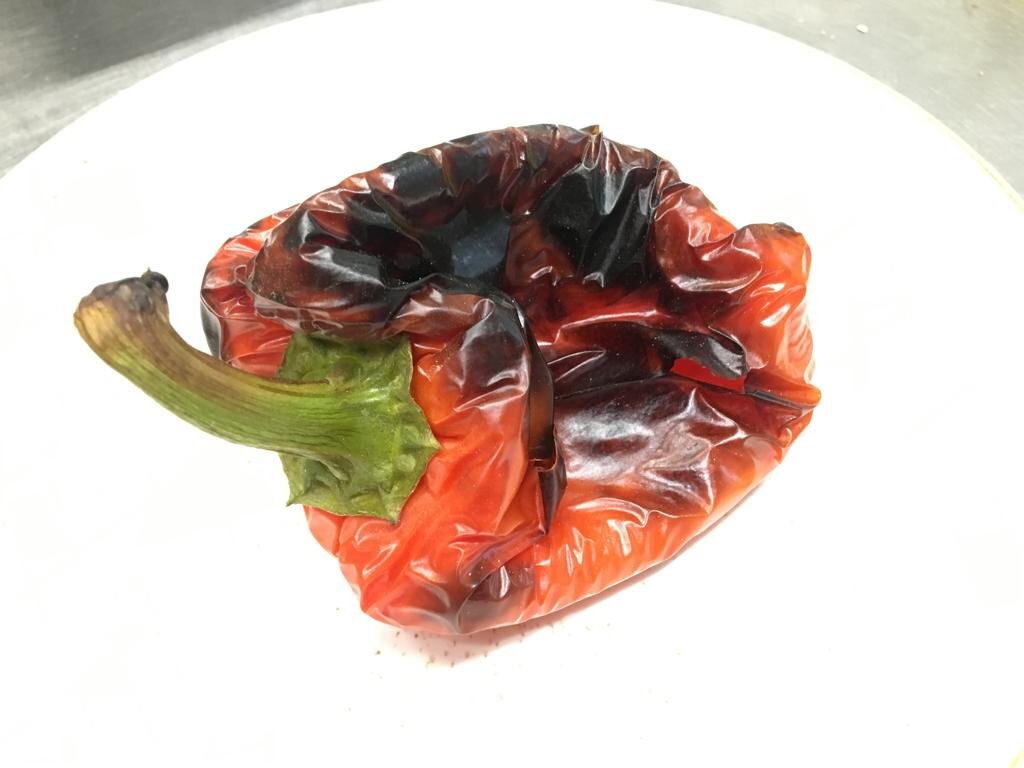 Сразу после запекания накройте противень фольгой и дайте остыть в таком виде. Тогда кожа будет сниматься очень просто. Далее снимите кожу с перца и улалите семена. Получится так называемое филе.