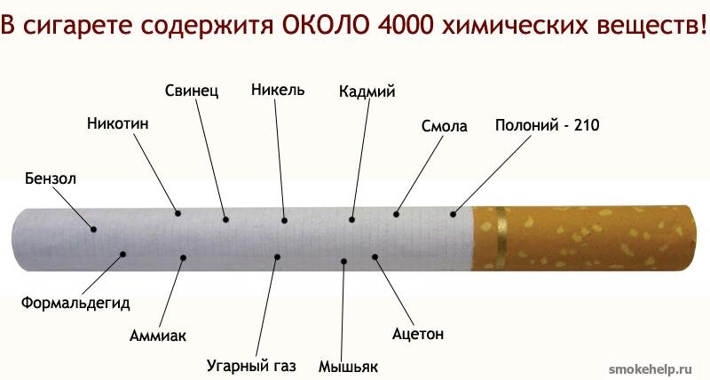 Состав дыма : Как бы это странно ни звучало, но дым - это не только газ, но еще и твердые частички, которые оседают в легких. Помимо отравляющего действия, они еще раздражают слизистую бронхов, вызывая частые воспалительные или аллергические реакции. Основную часть сигатерного дыма составляет газ, а точнее смесь газов. Все они достаточно ядовиты, чтобы навредить по-одиночке, а вместе представляют собой поистине ядерную комбинацию: - угарный и углекислый газ; - акролеин; - ацетальдегид; - аммоний; - ацетон; - нитробензол; - изопрен; - сероводород. Список "убойных" веществ 1. Ацетальдегид – при попадании в кровь окисляется до уксусной кислоты, является причиной генных мутаций у плода, влияет на гормональный обмен, выработку простагландинов и лейкотриенов, оказывает разрушающее влияние на нервную систему. Содержится и в алкогольных продуктах тоже. 2. Ацетон – летучий растворитель, токсическое вещество, вызывающее наркотическое опьянение. Кумулируется в организме, вызывая хроническое