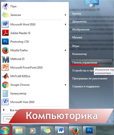 На нижней панели рабочего стола кнопку «Пуск» или жмём клавишу Windows на клавиатуре. Открылся Пуск - Затем выбираем «Панель управления».