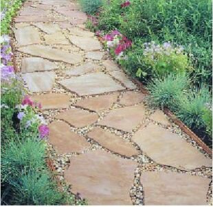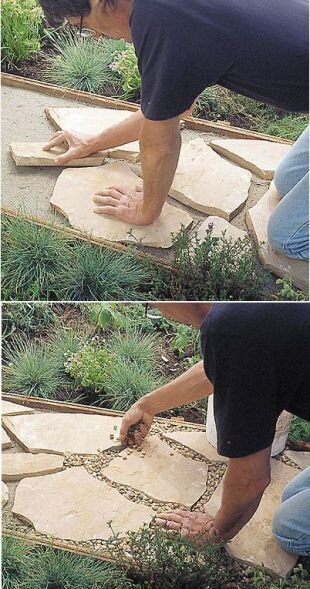 Идеи для дачи и сада (фото). Дорожка из камней. Вам понадобится: - агроткань (для ландшафтного дизайна) - лопата - грабли - щебенка, песок - киянка - доски для бордюров (при желании). 1. Для начала нужно вырыть неглубокую (около 10 см) траншею там, где у вас будет находиться дорожка. * При желании можете использовать доски, чтобы сделать по бокам дорожки бордюры. * Также можете постелить агроткань, перед тем, как насыпать песок, чтобы предотвратить появление бурьянов. 2. Засыпьте песком траншею примерно на 3 см. При желании можете поверх песка насыпать щебенку или гравий. Распрямите его граблей. 3. Начните аккуратно укладывать плоские камни. Вместо камней можно использовать кирпичи или фрагменты плитки. Используйте резиновую киянку, чтобы камни прочнее лежали. 4. Просветы засыпьте песком. Вот еще несколько вариантов дорожек из камней: