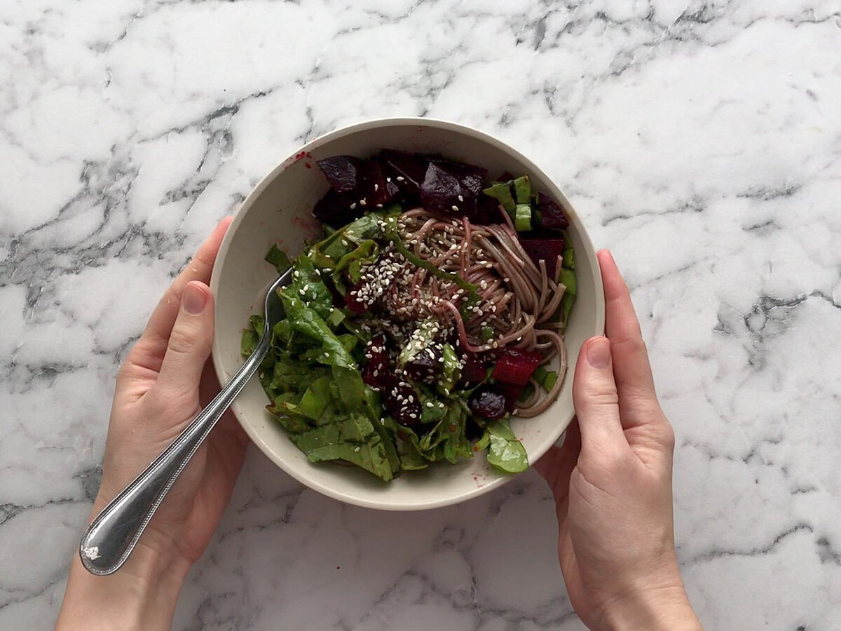 Блюдо собирается особенно быстро, если делать из уже готовых остатков. Свекла была запечена для винегрета, шпинат был промыт и просто лежал, ждал, лапша соба осталась с ужина. Салат сытный засчет собы и полезный благодаря шпинату и свекле. Эта веганская версия отлично подойдет в жару, когда хочется легкой пищи. Но если вы мясоед, то добавьте любой белок на ваш вкус :) Даже если ингредиенты сырые и ждут, чтобы их приготовили, все просто, я по шагам покажу, расскажу. Ингредиенты: Гречневая лапша соба или любая другая любимая — считайте по количеству едоков, шпинат — пучок или любой другой листовой салат на ваш вкус. печеная свекла — 1/2 или по вкусу. Для соуса: растительное масло — 2 ст. ложки, мед или сироп топинамбура — 1 ст. ложка соевый соус — 1 ст. ложка, сок дольки лимона. Приготовление Самое долгое — это свекла. Свеклу нужно заранее отварить или запечь по моему рецепту. Плюс время на то, чтобы остыла. Шпинат промыть, обсушить на полотенце. Собу отварить по инструкции на упак