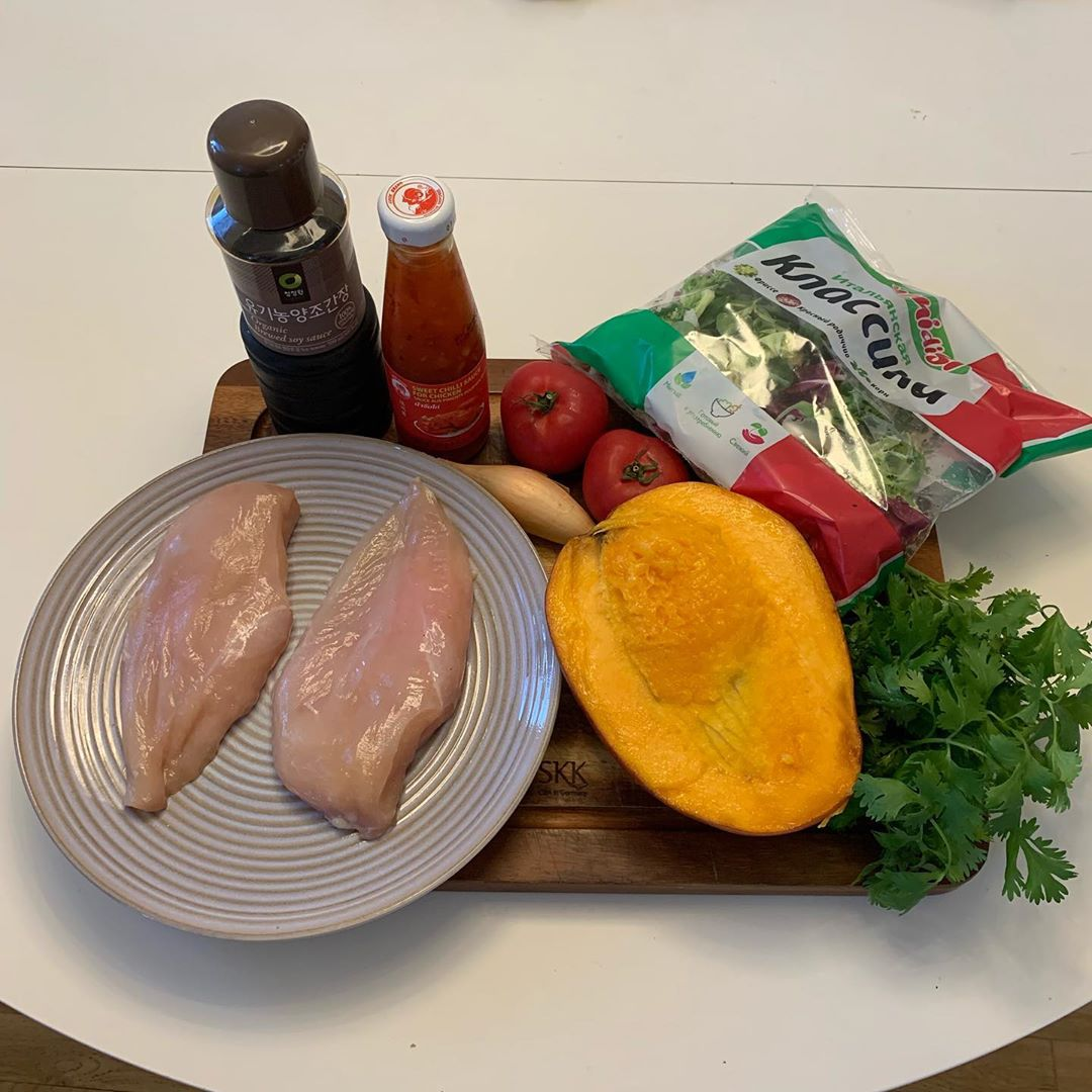 Очередной рецепт с историей о том, что нужно меньше пить. В далекие студенческие годы отправились мы с другом изучать местные бары и так наизучались, что у меня отключилась память. На утро, весь в похмелье я открыл глаза и обнаружил, что нахожусь в чужой незнакомой квартире. Как я туда попал, когда, почему и с кем? В голове ответов не оказалось. Я осторожно себя ощупал. Штаны, трусы, бумажник, ключи и майка на месте. С опаской я вышел в гостиную, а там на диване валялся мой друг, чья память, увы, тоже где-то заблудилась. Мы принялись звать хозяев. Никого. Поверхностное исследование квартиры результатов тоже не дало - ни фотографий, ни почты или каких-либо определяющих вещей. На автоответчике стандартный женский голос. Мы уселись ждать жильцов, но дождались лишь голод, который заставил нас залезть в холодильник, где сидел весьма аскетичный набор: куриная грудка, помидор, кусок манго, сладкий соус Чили, лук, салатный микс и зелень. Из всего этого я смастерил блюдо, которое живет со мной