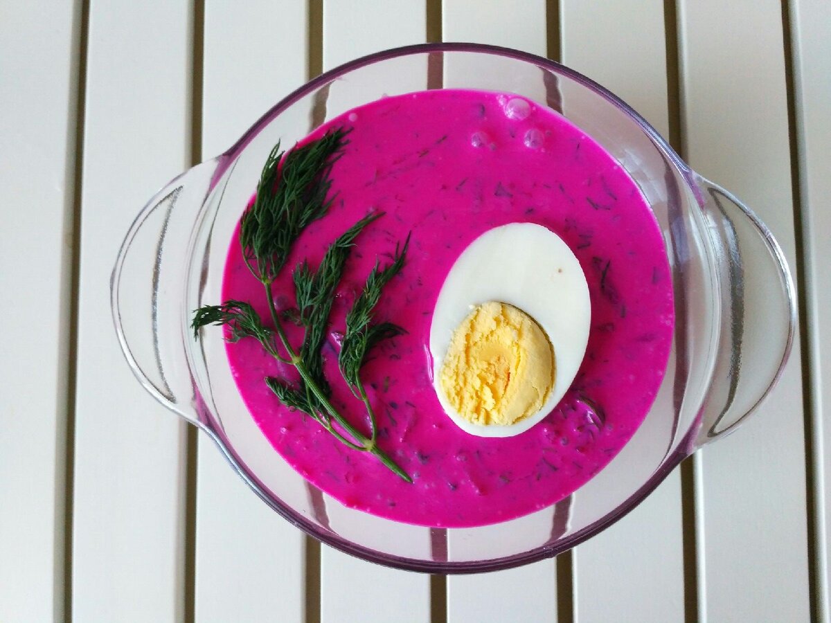 На улице жара и хочется чего-то лёгкого на обед. Самый подходящий вариант для летнего стола, это холодный борщ. Состав: Свекла – 4-5 средних Яйцо – 8 шт. Огурцы – 0,5 кг. Зелень (укроп, петрушка) – по большому пучку Кефир – 1 литр Сметана – 3 столовых ложки Вода кипячёная – 0,5 литра Соль Приготовление: Свеклу отварить примерно минут 40-50. Готовность можно проверить вилкой проткнув свеклу. После того как свекла сварила, для лучшего процесса очистки, слить горячую воду и тут же залить свеклу холодной водой, оставить минут на 15. Сварить яйца вкрутую. Также быстро слить горячую воду и залить яйца холодной водой для лучшей очистки. Далее свеклу очистить и натереть на крупной тёрке в большую миску или кастрюльку. Залить кипячёной водой, чтобы свекла отдала цвет воде. Огурцы промыть, срезать попки и также как и свеклу натереть на крупной тёрке. Яйца нарезать крупными ломтиками, кубиками. Зелень мелко нашинковать. Всё смешать в той кастрюльке или миске, где свекла с водой. ВОДУ со свеклы