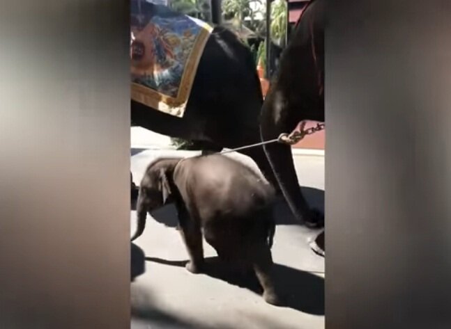 Теперь уже далеко не секрет что в таких странах как Таиланд используют животных для развлечения туристов. Не исключение и такие величественные животные как слоны. Слоны это очень умное, интеллектуально развитое животное. К сожалению в Таиланде, соблюдение правил по содержанию слонов просто не существует. Кому то совершенно безразлична эта проблема, кого то наоборот возмущает положение дел. Один турист в Паттайе снял шокирующие кадры издевательства по отношению к маленькому слоненку. Малыш был привязан за шею веревкой, которая врезалась в кожу. Другой конец этой веревки был привязан к шее матери. В сорокоградусную жару, эти слоны были вынуждены идти по улицам города, что бы развлекать посетителей. В какое то мгновение малыш от жары потерял сознание и упал на асфальт. Слониха мать как могла пыталась поставить слоненка на ноги. А в это время все просто стояли и смотрели..и только несколько человек обрушили шквал критики на владельцев. На что получили ответ, что в этой стране нормально
