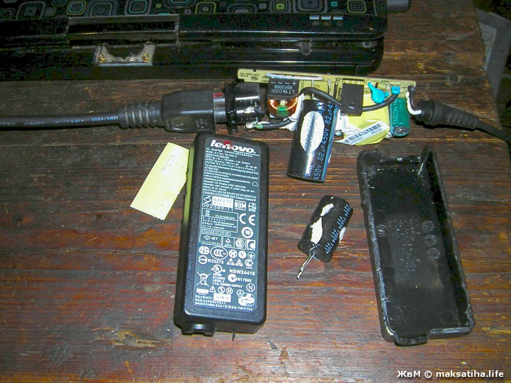 На днях из-за скачка напряжения сломался блок питания от дочкиного ноутбука «Lenovo». Упало дерево на провода в результате чего семья лишилась компьютера, стиральной машины и монитора. Кстати, вот не понимаю — откуда в провинции такая любовь сажать деревья строго под проводами? И возмущаться, когда их вырубают. Блок питания я разобрал, восхитился взорванным конденсатором, протёр внутренности от электролита, конденсатор заменил. Вольтметр показал, что прибор теперь выдаёт нужные 20 вольт. Однако, «что-то пошло не так» и заряжаться ноутбук решительно отказался. Наверное, что-то ещё испортилось — транзисторы-диоды всякие, но это уже вне моей компетенции. Эту область пока ещё не освоил. Решил исследовать «закрома», чтобы найти в них нечто такое электрическое, которое бы выдавало постоянный ток в районе 20 вольт. И к моему удивлению нашёл! Почти именно такие цифры древние мастера высекли на коробочке, прикрученной к низу принтера «Canon» — 25 вольт. Правда сила выходного тока маловата — 0.6