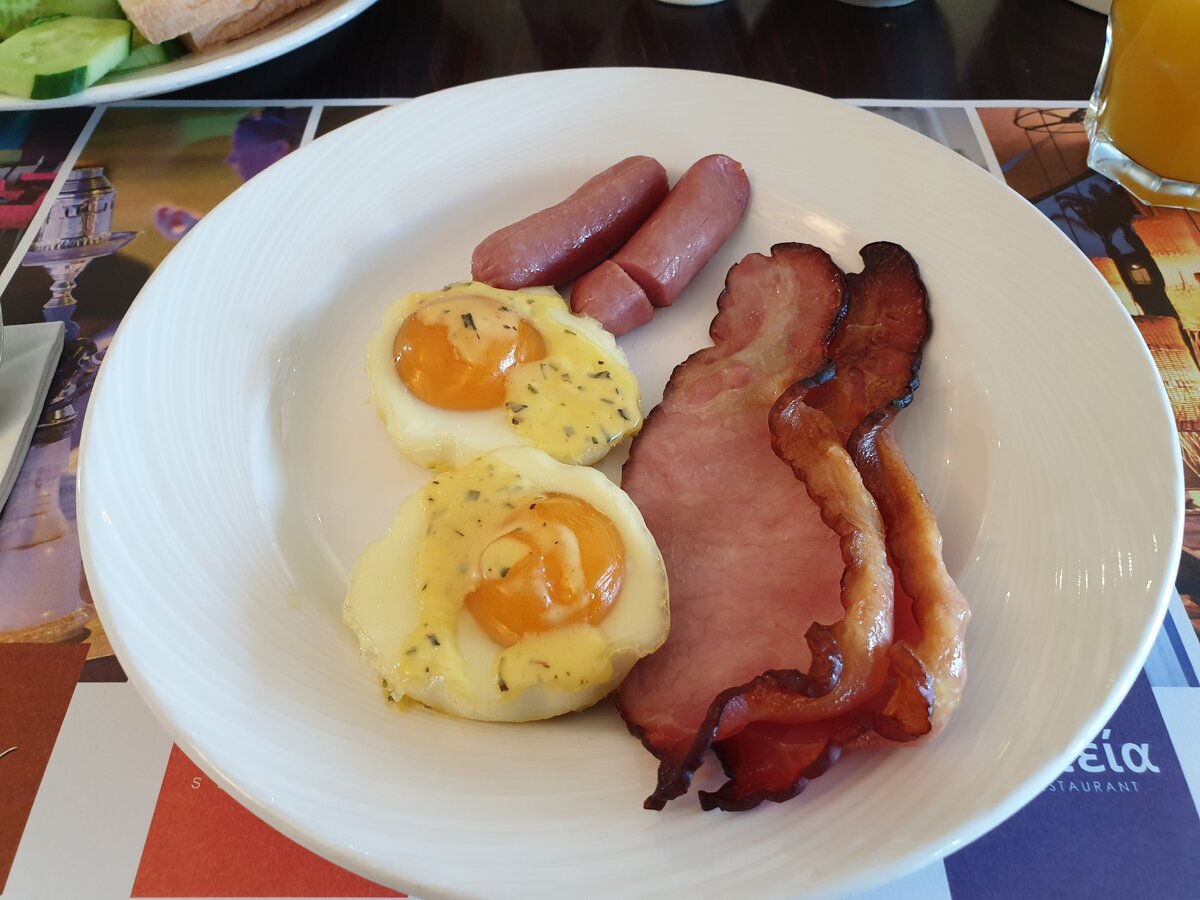Сосиски на вкус абсолютно отвратные, а бекон больше похож не на жаренный, а на вареный.