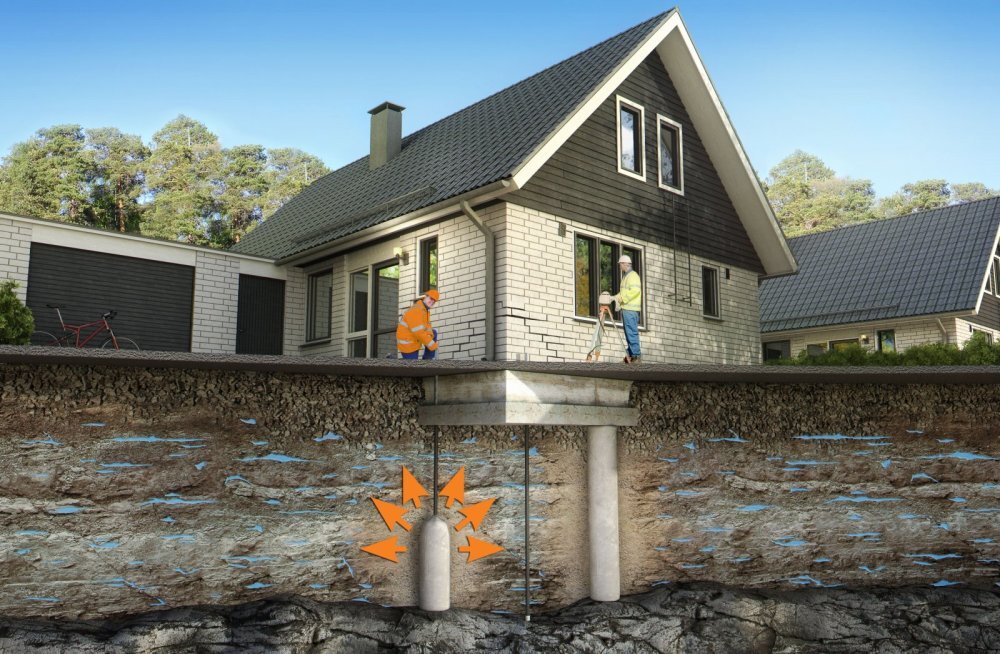 Чтобы определить дальнейший план действий, нужно наклеить маяки и проследить, как быстро они порвутся. Если процесс идет быстро, то нужно начинать действовать. Под углом 35 градусов выкапывается яма до уровня постелистого камня. В эту яму вставляют трубу приличного диаметра и в нее заливают слабый бетон. На этом этапе нужно подождать пока грунт под фундаментом не насытиться раствором. Раствор добавляют до того момента, как он перестанет уходить в грунт. Такая оп