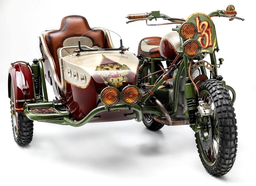 В американском тюнинг-ателье Le Mani Moto создан очередной кастом на базе российского сайдкара производства Ирбитского мотозавода. Базой для него послужил карбюраторный Ural Gear-Up с приводом на колесо коляски, сделанный в 2006 г. В техническую «начинку» тюнингеры лезть не стали, ограничившись лишь дефектовкой и доводкой мотора и КП, а также установкой воздушных фильтров нулевого сопротивления, передней рычажной вилки и прямоточной выхлопной системы собственного производства. А вот внешность сайдкара изменили по полной программе. Мотоцикл выполнен в русском колорите, как его понимают американцы: в отделке появились полированная бронза, древесина ценных пород, натуральная кожа и твид. Байк лишился сёдел-«лягушек», место которых заняло 1-местное седло с «горбом» в кафе-рейсерском стиле. Появилась также пара фар с защитными решётками, сделанными в том же стиле, что и установленное на раме коляски «сафари». Сама коляска переделана почти до неузнаваемости. Её «салон» отделан твидом и кожей