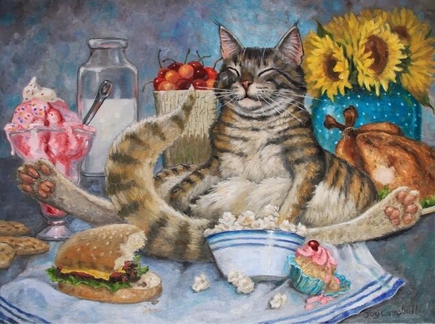 Джой Кэмпбелл (Joy Campbell) - художница из США, которая уже более 30 лет пишет картины, героями которых становятся коты. Работы выполнены главным образом в масле. Основной посыл - наслаждение кошачьей жизнью. Удовольствия много не бывает! Если вы живете с пушистым соседом из семейства кошачьих, вы наверняка узнаете своего питомца на этих картинах. Конечно, кое-что преувеличено... Но разве не такими мы видим их, дополняя происходящее деталями из воображения? Хотите запечатлеть своего питомца на портрете и сохранить навсегда память о его характере? Пишите мне на е-мейл paintpetsstudio@gmail.com или звоните по телефону: +7 (985) 764-09-94.