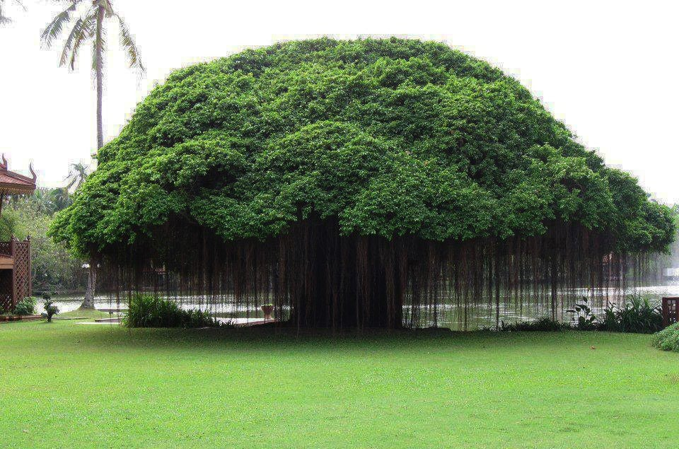 Баньян относится к числу деревьев-гигантов. Как известно, в природе все существа, обладающие большими размерами, испытывают вследствие этого множество неудобств, и деревья отнюдь не являются исключениями. Например, у слишком толстых деревьев возникает проблема подъема влаги и питательных веществ от корней до верхушки. К тому же стволы у них должны быть весьма прочными, прямыми и не очень высокими, чтобы не сломаться. Такому дереву необходимо иметь широкое основание, способное выдержать груз раскидистой кроны, а если ветви становятся чересчур длинными и тяжелыми, то ствол может накрениться в ту или другую сторону и в конце концов упасть. Все эти и некоторые другие проблемы баньяну — гигантскому дереву, растущему в Индии и Малайзии — удалось решить весьма любопытным способом. В этом дереве самое необычное то, как растут его ветви. Многочисленные и тяжелые, они разбегаются во всех направлениях от ствола, хотя и могучего, но тем не менее не способного выдержать их вес самостоятельно. Весь