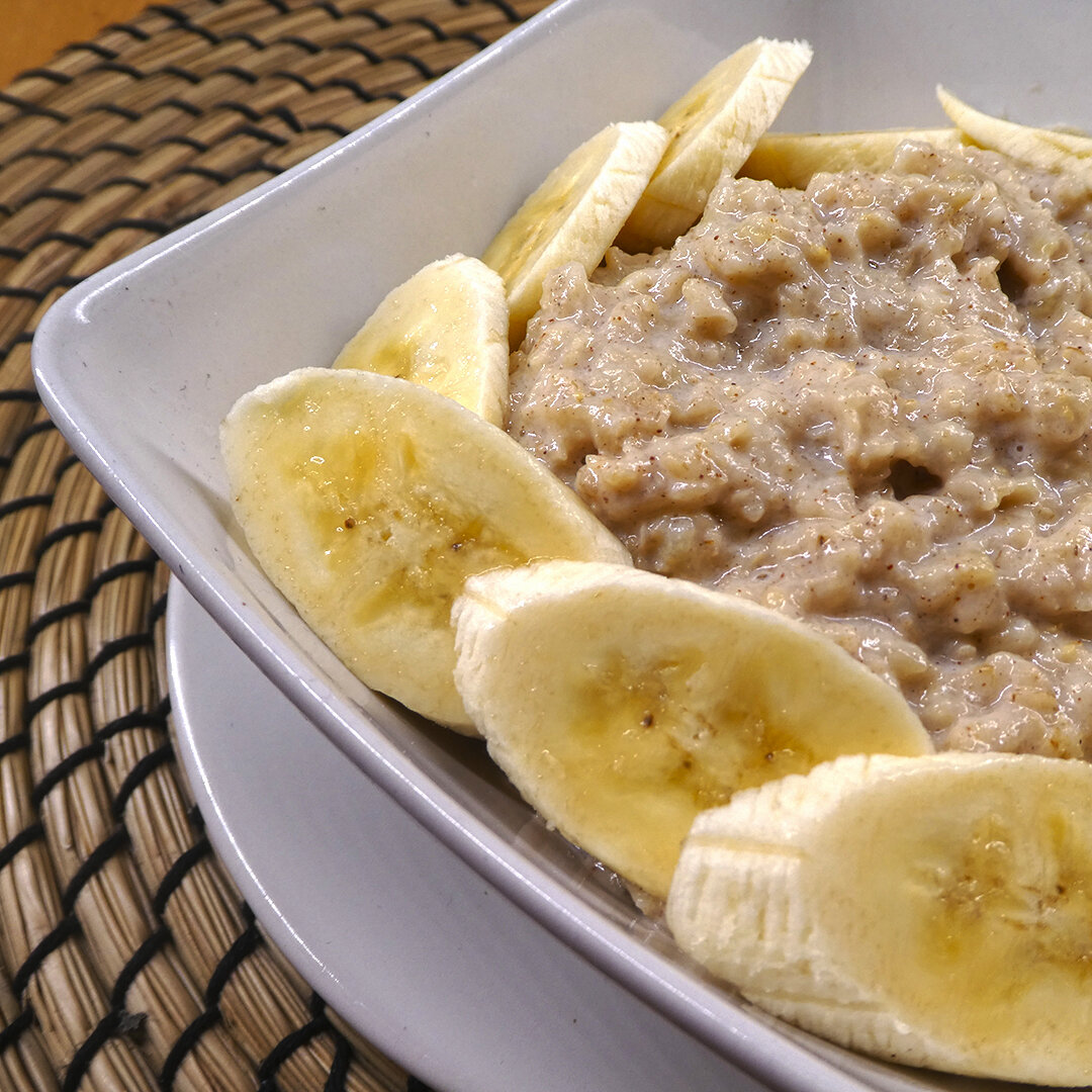 Сегодня я расскажу как приготовить вкусную кашу - овсянку. Этот рецепт овсянки очень просто и полезен. Я варю овсянку на молоке, но можно варить овсянку на воде. Если ваш ребенок не любит обычную овсяную кашу приготовьте для него прокачанный вариант овсянки - уверен ему очень понравиться! Ингредиенты: Молоко 2 ст. Овсяные хлопья 1 ст. Масло слив. 5гр. Корица 0,5 ч.л. Бананы 2 шт. Сахар 1 ст.л. Соль В закипающее молоко добавить соль сахар по вкусу. Положить хлопья овсяные, перемешать. Добавить корицу молотую и бананы порезанные на небольшие кусочки. Варить в течении 4-5 минут. После этого накрыть крышкой и дать настоятся в течении 3-4 минут.