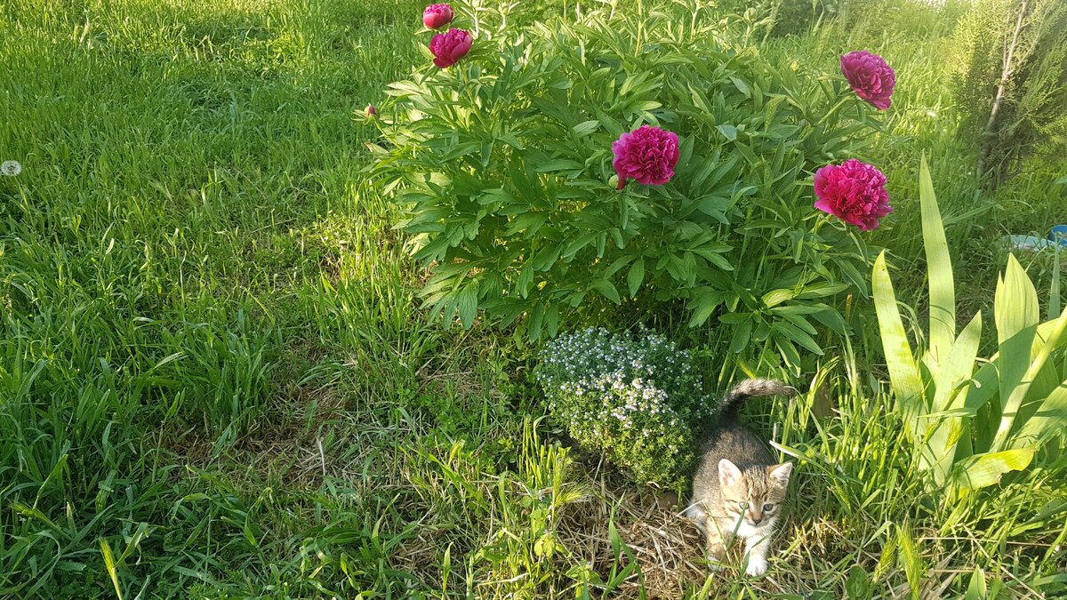 Второй чабрец, кустовой, мы купили в питомнике. Это невысокий округлый кустик сантиметров 20 в диаметре с одревесневшим стеблем и мелкими округлыми листочками. Его вы видите на фотографии в начале статьи. Посажен на газоне рядом с пионом с юго-западной стороны, так чтобы пион основную часть дня не затенял чабрец от солнца. Кошки любят валяться в чабреце. Видно его запах для них слаще валерьянки.