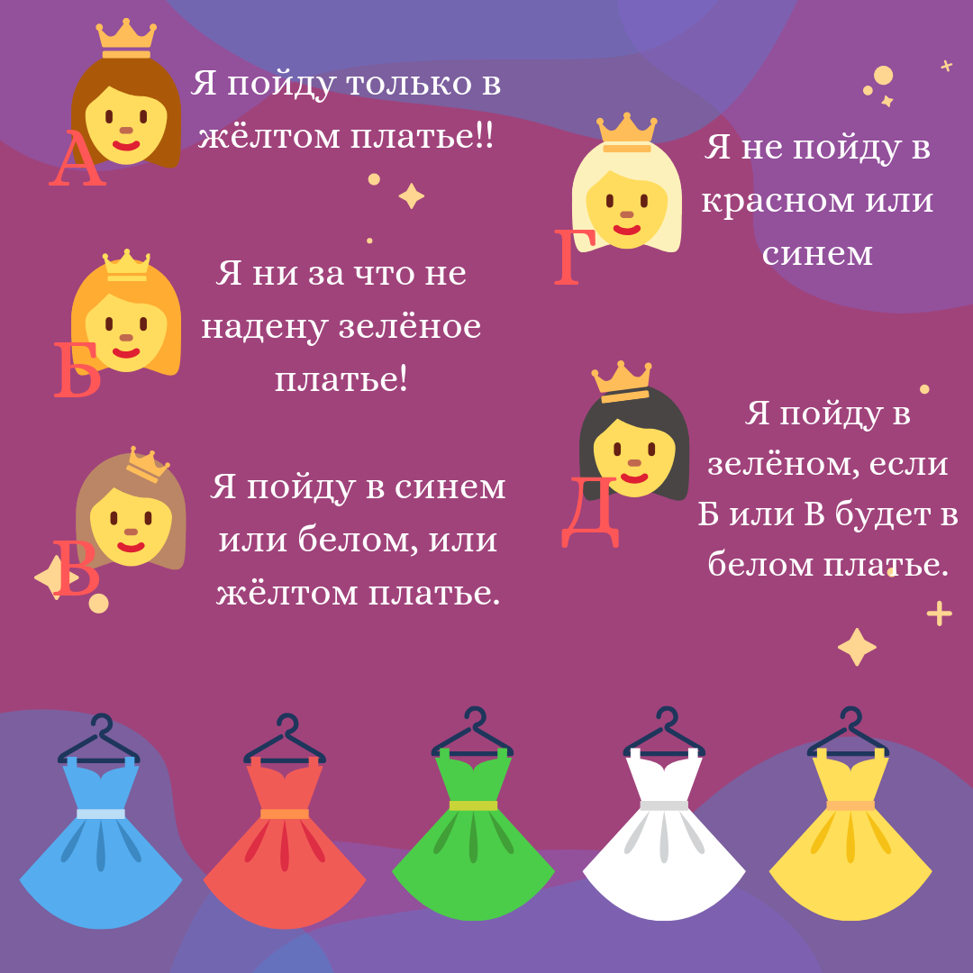 Пять принцесс (А, Б, В, Г, Д) собрались на бал. Портной - самый известный в королевстве - сшил пять чудесных платьев: синее, красное, зелёное, белое и жёлтое. Накануне бала принцессы приехали за нарядами и начали капризничать. А настаивает на жёлтом платье; Б против зелёного; В хочет синее или белое, или жёлтое платье; Г против красного и синего; Д согласна на зелёное, но только в том случае, если Б или В согласятся на белое. Портной легко распределил все пять платьев так, что каждая принцесса осталась довольна. Как он это сделал? Как это решать? Для начала расположим все данные в таблице. Это наглядно и удобно. Теперь предположим, что Б согласится на белое платье - в этом случае Д выберет зелёное. Получается, что для Г не хватает платья! Это неприемлемо. Аналогичная ситуация будет и в случае, если на белое платье согласится В. Это значит, что можно вычеркнуть белое платье в строках Б и В. Остаётся не так много вариантов: принцесса В точно выберет синее платье. Тогда для принцессы