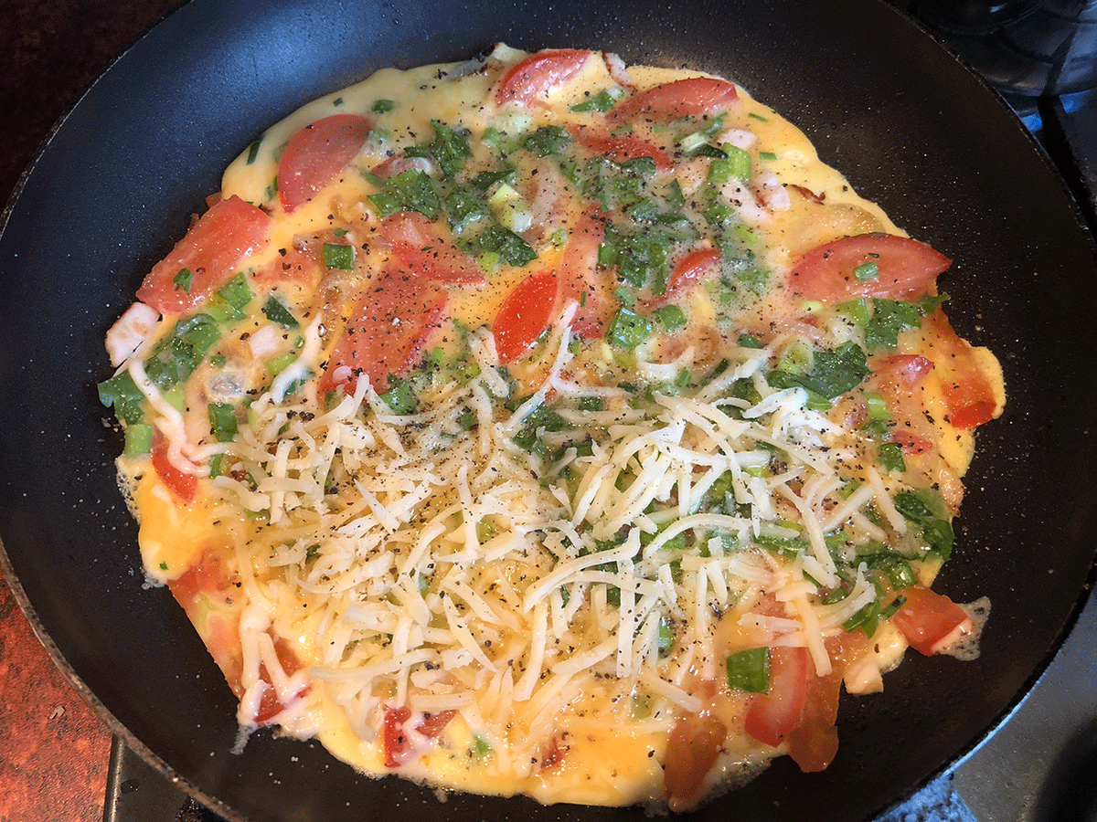 Утром мы обычно торопимся: на работу, службу, в школу, университет, по делам... Времени на приготовление пищи катастрофически не хватает. В лучшем случае мы привыкли довольствоваться бутербродом и кофе. Хотя есть семьи, в которых утренняя трапеза начинается с молочной каши, сырников или блинчиков. Я не буду отнимать у вас много времени и поделюсь рецептом для холостяков (этот рецепт пришел ко мне от коллеги по работе, заядлого холостяка) и женщин, ненавидящих утреннюю готовку. Это будет омлет, полезный, вкусный, сочный, с овощами. Simple-eat.ru Первым делом приготовим все ингредиенты. На 2 человека нам нужно будет 3-4 куриных яйца, немного соли, любимые специи, пряности, половина болгарского перца (лучше красного), пара томатов, 1/4 репчатого лука, зелень, сыр. На растительном масле начинаем обжаривать полоски болгарского перца, затем добавляем к ним кружки или полукружки помидоров, ждём пока овощи дадут сок, выпариваем его и слегка румяним овощи до корочки. Всыпаем в сковороду мелкие