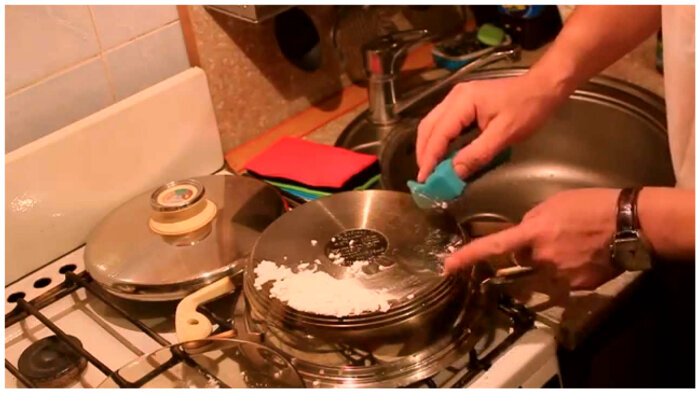 Для чистки посуды следует использовать крупную соль, так называемую «каменную». Чистка солью происходит необычным способом: сначала нужно налить в загрязнённую емкость воду и дать постоять 1,5-2 часа. После этого воду следует слить, а места загрязнений присыпать крупной солью. Снова оставить на 1,5-2 часа. Затем вымыть привычным способом.