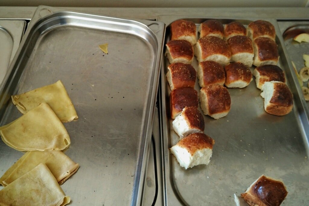 Омлет с завёрнутыми внутрь лесными грибочками и чем-то ещё. Всё тот же мёд, джемы, овощи, нарезки и европейские сыры. Отмечу, что в меню отеля они были просто безупречными, из дорогих серий. Никакой вам обычной Гауды или Маасдама.
