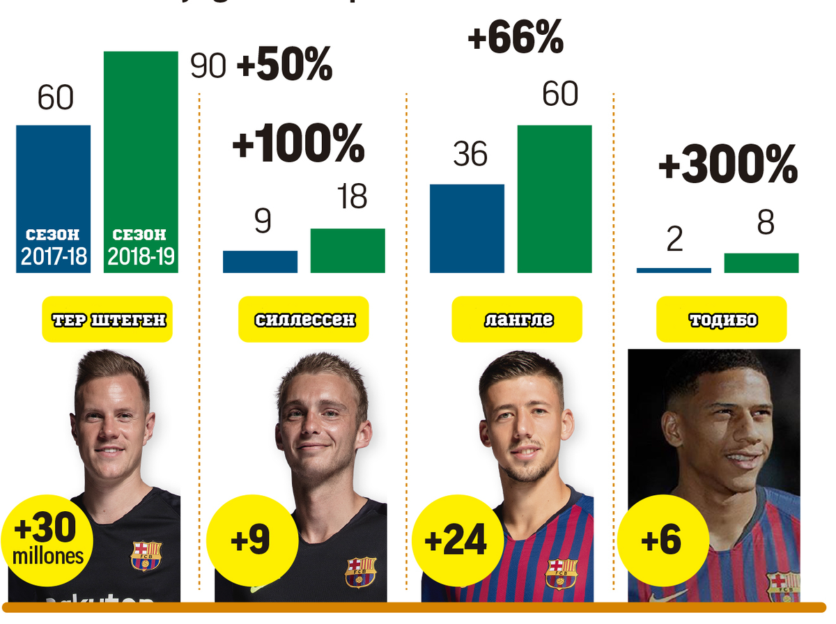 Как всегда, после окончания футбольного сезона мы все с нетерпением устремляем свой взор на трансферный рынок, событие в котором европейские элитные клубы получают контроль над ситуацией, а другие пытаются решить свои проблемы и оторвать лакомые кусочки от пирога. Это лето ничем не отличается, «Реал Мадрид» стал первопроходцем, но «Барселоне» нужно действовать быстро, и в «Камп Ноу» запланировано множество трансферов. Учитывая то, как закончился для них сезон(главная цель у них была - Кубок Лиги Чемпионов), можно предположить, что многие игроки в команде потеряли в своей рыночной цене и общая сумма игроков команды сильно опустилась, но это не совсем так, и общая стоимость их первого состава снизилась всего на 6,5 млн евро по сравнению с кампанией 2017/18 года, что является незначительной суммой, когда общая стоимость превышает 1 миллиард евро. Восемь игроков команды стали свидетелями роста своей стоимости - Марк-Андре тер Штеген, Яспер Силлессен, Клеман Лангле, Нелсон Семеду, Жан-Кл