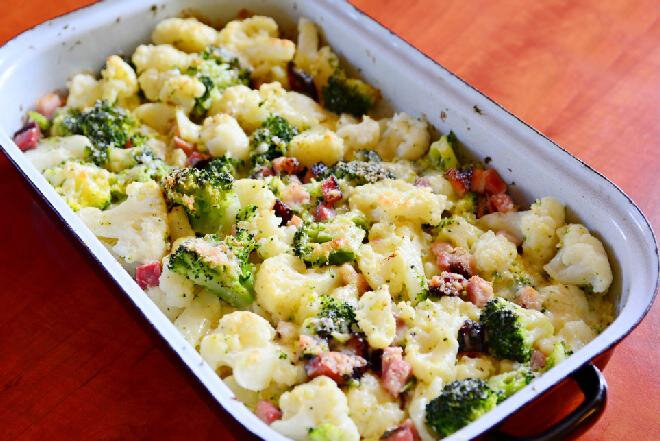 Цветная капуста, запеченная с брокколи и беконом, - это вкусное блюдо или дополнение к жареному мясу или рыбе. Ингредиенты