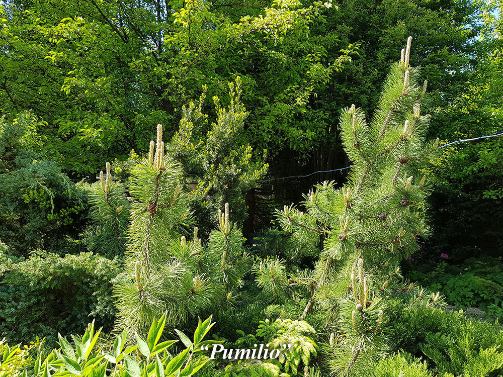 Очаровательные карликовые сосны за год прирастают всего на 4–8 сантиметров и имеют очень плотную подушковидную форму кроны, например, сорта “Picobello” (“Пикобэлло”), “Benjamin” (“Бэнджамин”), “Mini Mops” (“Мини Мопс”) или украшенный красноватыми почками сорт “Humpy” (“Хампи”). Округлые и густые сосенки “Pigglemee” (“Пиглми”), “Mini Meylan” (“Мини Мейлан”) или “Mini Mini” (“Мини Мини”) имеют тёмно-зелёную хвою и в десятилетнем возрасте не превышают в высоту 30–40 сантиметров, а такая же маленькая “Dezember Gold” (“Децембер Гольд”) осенью становится золотисто-жёлтой.