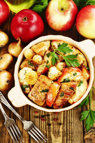 6. Курицу с яблоками выложить в форму для запекания, залить приготовленной смесью и выпекать в разогретой до 200 градусов духовке 10 минут. Нежный сливочный суп Чем заменить сладкое на диете Больше рецептов на Racionika.ru!