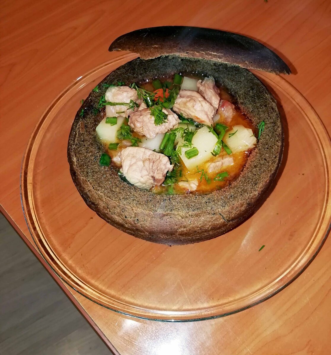 Всем привет, дорогие друзья. Я вам показывал, как я готовлю плов для настоящих мужиков. Сегодня вашему вниманию снова блюдо из серии Мужская Еда. Это простой суп в красивой и вкусной упаковке итак поехали. Для начала нам нужно подготовить хлеб. На каждую порцию берем по одному круглому хлебу. Лучше использовать бородинский черный, но можно и просто круглый серый. В некоторых регионах он называется "Сельский". Отрезаем верх у хлеба и вырезаем мякиш. Получается тарелка. Бока оставляем по 1.5 см. Разогреваем духовку до 150 гр. В это время режем мясо, картофель, кубиками по 1.5 см стороной. Морковь по 1 см. Отправляем хлеб в духовку. "Тарелки" хлеба должны быть открыты. Лук режем мелкими кубиками. Мясо обжариваем в кастрюле с толстым дном, (казанке). Достаем хлеб через 15 мин. Сразу после того как его вынули из духовки он еще мягкий, но через минут 10 он станет гораздо жестче. После обжарки мяса, добавляем к нему лук, и почти сразу морковь, перчим, солим и добавляем паприку. Дождавшись,