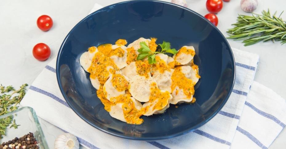 паприка сладкая молотая Способ приготовления 1. Просеиваем муку в глубокую миску, добавляем щепотку соли, перемешиваем, добавляем 1 ч. л. сливочного масла комнатной температуры и растираем с мукой руками. Вбиваем 1 яйцо, замешиваем упругое, эластичное тесто, постепенно добавляя воду. Собираем его в шар, оборачиваем плёнкой и оставляем на 20 минут на расстойку. 2. Для начинки берём домашний фарш из говядины и свинины, солим, добавляем смесь сушёных трав, свежемолотый чёрный перец, перемешиваем и даём настояться. Откладываем часть фарша в миску и вливаем в него небольшое количество воды. 3. Присыпаем рабочую поверхность мукой, раскатываем тесто, вырезаем кружки желаемого диаметра. На тесто выкладываем фарш, смачивая кромку теста водой, и лепим пельмени. 4. Кипятим воду с добавлением соли, сушёных грибов, лаврового листа и горошин перца. Отвариваем пельмени до готовности. 5. Для соуса выкладываем помидоры в чашу блендера, добавляем зелень укропа, петрушки, очищенный зубчик чеснока,