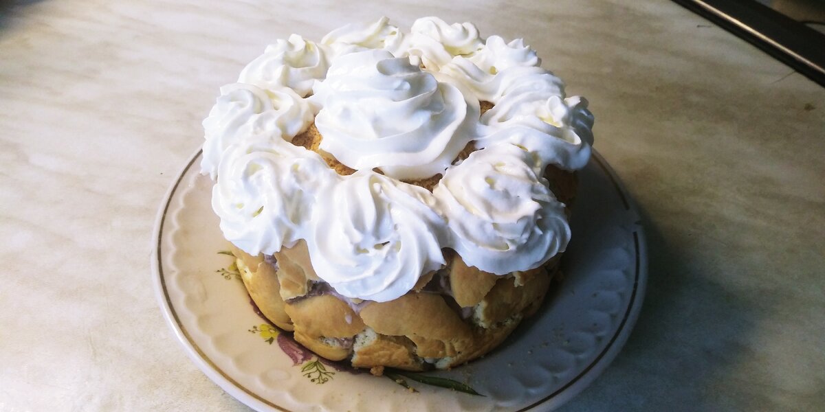Украсили торт мы просто взбитыми сливками, но такой красоты нам хватило ровно на то, чтобы сделать фото ребенка ковыряющего торт ложкой, а потом сливки осели и потекли.
