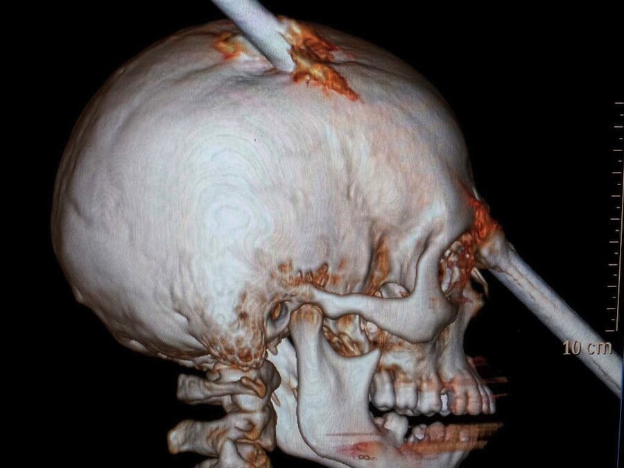 Заострённый стержень так глубоко засел в черепе, что прибывшие на место спасатели не рискнули его вынимать. Вместе с куском прута в голове потерпевшего доставили в реанимацию, где медикам удалось благополучно избавить Николаса от смертельно опасной «занозы».