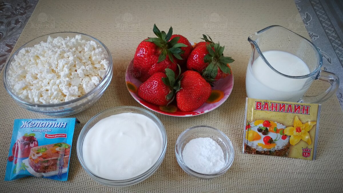 Бланманже - это нежнейший холодный десерт, который никого не оставит равнодушным! Очень привлекательно и аппетитно смотрится на праздничном столе! Да и в обычный день иногда можно порадовать домочадцев этим чудо-десертом! Ингредиенты (4 порции): · Молоко – ½ стакана · Творог – 250 грамм · Клубника крупная – 200 грамм · Сметана (15-20%) – ½ стакана (примерно 120 грамм) · Ванилин – 2 пакетика (всего 3 грамма) · Сахарная пудра – 2 столовые ложки · Желатин быстрорастворимый – 1 пакетик (10 грамм) · Корица – щепотка (по желанию) Способ приготовления: Приготовление начнём с того, что в чашу погружного блендера мы кладём творог, сметану, сахарную пудру и ванилин. Творог я взяла жирностью 2%, вы можете выбрать с любой жирностью, на вкусе это практически не отразится: Взбиваем до однородной пышной массы. Крупинки творога чувствоваться не должны: Затем подогреваем молоко. Оно не должно вскипеть, а должно быть тёплым. В тёплое молоко всып