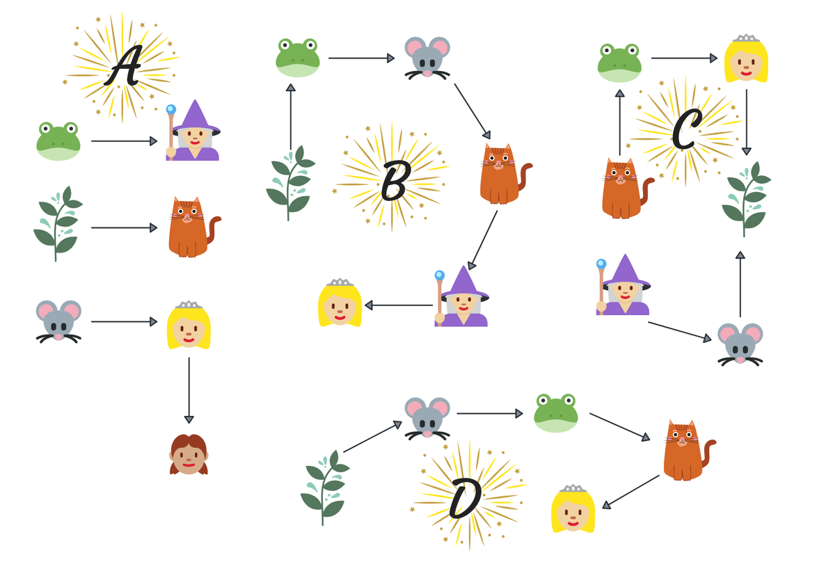Злая колдунья похитила принцессу и её камеристку! Она превратила принцессу – в кошку, а камеристку – в цветок. Добрая фея превратила злодейку в жабу, но она не может зайти на территорию злодейского замка, чтобы расколдовать остальных. Фея вручила рыцарю свою волшебную палочку – с её помощью он сможет сколдовать ТРИ заклинания превращения (из четырёх возможных: A B C D). Можно несколько раз колдовать одно заклинание, если это необходимо, но каждый такой раз засчитывается как новое заклинание. На картинке показано, какие заклинания каким образом действуют на уже заколдованных существ. Заклинание действует одновременно на всех. Важно произнести заклинания в нужном порядке. Рыцарь отправился на спасение девушек. Фея дала ему последние наставления: "Будь осторожнее: если злодейка примет человеческий облик (не важно свой или принцессы, или камеристки) она тут же тебя заколдует! И еще, если кошка окажется в комнате с мышкой, она непременное её съест. Инстинкты". Какие заклинания и в каком