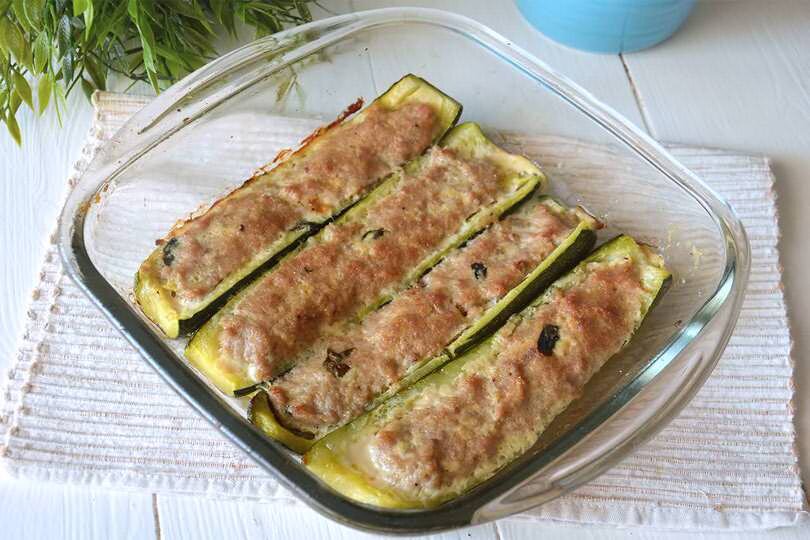 Очень легкий рецепт отличного сытного блюда. Необходимые ингредиенты: 2 кабачка фарш свиной - 150 гр. колбаса копченая - 150 гр. 1 яйцо 3 ст. ложки тертого твердого сыра петрушка св. соль перец немножко белого вина и оливкового масла. Кабачки промываем и разрезаем пополам. С помощью чайной ложки удаляем внутренности и бланшируем в подсоленной воде в течении 10 минут. По истечении этого времени сливаем воду и даем кабачкам остыть. Колбасу перебиваем в блендере вместе с фаршем. В миске перемешиваем фарш, яйцо, соль, перец, тертый сыр и мелко нарезанную петрушку. Кладем кабачки в форму для выпечки и начиняем полученным фаршем. Сбрызгиваем небольшим количеством масла и вина. Сверху посыпаем тертым сыром. Выпекаем в духовке при 170 гр. в течении 35 минут. Ваши кабачки, фаршированные мясом готовы. Приятного аппетита.