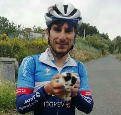 Итальянский велосипедист-профи Никколо Бонифацио проводил в мае тренировочный заезд на 20 км. Когда до мужчины донёсся слабый кошачий писк, то он решил пойти посмотреть, что случилось. Возле мусорного бака велосипедист увидел маленького котёнка, которого здесь, видимо, бросили умирать. Дальше тренировка Никколо превратилась в спасательную операцию. Он увидел, что котёнку плохо и повёз его в клинику. За время пути он привязался к малышу и решил забрать найдёныша себе. Никола рассказал, что Бисус, так назвали котёнка, стал полноправным членом их семьи. Милый пушистик очень нежный, поэтому его так и назвали: в переводе кличка означает поцелуй. А для малютки эта встреча стала настоящим поцелуем судьбы, спасшим от неминуемой гибели.
