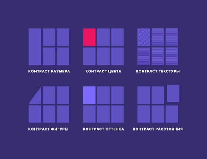 Контраст — фундаментальная основа веб-дизайна. Разницу между двумя и более элементов называют контрастом. Создать контраст возможно с помощью следующих техник: Сегодня мы конкретно остановимся на технике цветового контраста. Сочетание различных цветов, поможет визуально разделить страницу по блокам и создать контраст ключевых элементов сайта. Основная задача цветового контраста — управление вниманием пользователя. Цвет поможет усилить важные элементы, и в тот же момент приглушить второстепенные. Важно взять себе за правило выделять только те элементы, на которых мы хотим сфокусировать внимание посетителя сайта. Если же вы выделите много элементов, то произойдет расфокусировка, и глазам не за что будет зацепиться. Таким образом, пользователь начнет теряться в предоставленной информации. В качестве важного элемента, можно выделить кнопку призыва к действию: Цветовой контраст позволяет строить иерархию на сайте и помогает переключать внимание между блоками: К чему приводит плохой цветово