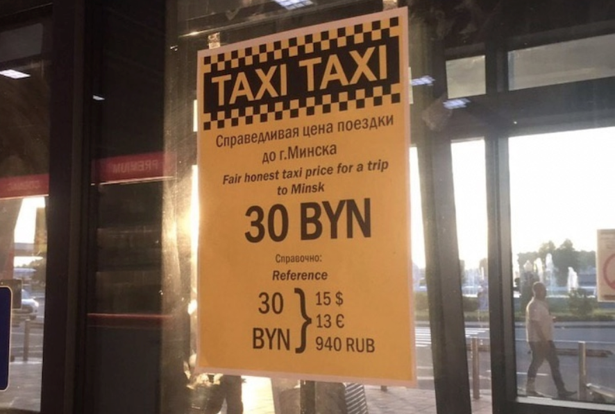 Вот такое объявление появилось недавно в Национальном аэропорту Минск на выходе из зоны прилёта. Привлекающая внимание надпись TAXI и под ней "справедливая цена поездки до Минска" в разных валютах. Удобно, понятно и доступно. Потому что иностранцы, прилетающие в страну в том числе по безвизу, могут не знать, сколько ехать до города и сколько это может стоить. В то же время так называемые бомбилы встречают пассажиров сразу на выходе из терминала и заманивают в свои авто, предлагая быстро и недорого домчать до столицы. Вот только как гость может знать, сколько это – недорого? Цена в 30 BYN при этом не высосана из пальца. Именно столько стоит трансфер службой самого аэропорта на комфортабельных авто. Чуть дороже обойдется поездка на машинах сервисов UBER или Яндекс Такси. Собственно, это и есть справедливая цена. Всё, что выше – это уже переплата. Кстати, помимо такси из аэропорта ходят рейсовые автобусы и маршрутки. Поездка в них стоит на порядок дешевле, однако есть объективный минус –