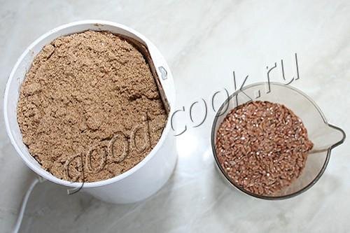Семена льна размолоть в кофемолке до состояния муки. Если есть время, то залить льняную муку 100 граммами холодной кипячёной воды и оставить от 3 до 6 часов.