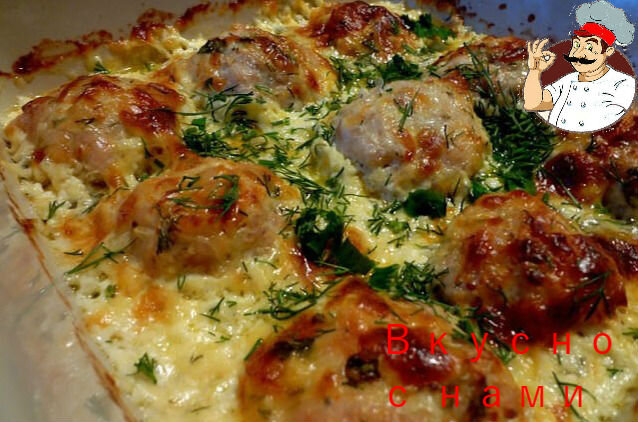 Полить все мясные шарики соусом, так, чтоб сыр был поверх шариков, и запекать еще около 20 минут, до румяного верха.