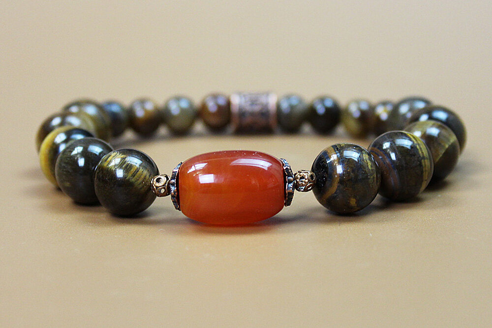 Бижутерия из натуральных камней своими руками. Какой самый простой способ создания браслета из бусин? Можно конечно по старинке собрать на лесочку, на шнурок. Но мы с вами сделаем браслет без замка на эластичном шнуре. Сейчас в продаже есть специальные растягивающиеся (как резинка) основы для браслетов. Эластичная нить (резинка) для браслетов (спандекс) бело-прозрачного цвета из силикона. Как видно из фото - можно подобрать любую подходящую толщину. Где купить? Все дороги ведут в Китай, на сайт Алиэкспресс. Ждать заказ долго, но купить можно дешево. Камни (бусины) в основном я тоже покупаю там Нанизываем нужное количество бусин. Завязываем прочный узел и прячем его в бусину. И все... браслет готов! Браслет на фото сделан из натуральных, природных бусин (Тигровый глаз). Центральная бусина из сердолика. Добавлено немного медной фурнитуры. Посмотрите видео урок - Как собрать ожерелье с натуральными, природными камнями на специальный ювелирный тросик. Валерий Воробьев. Мастерская "Рукод