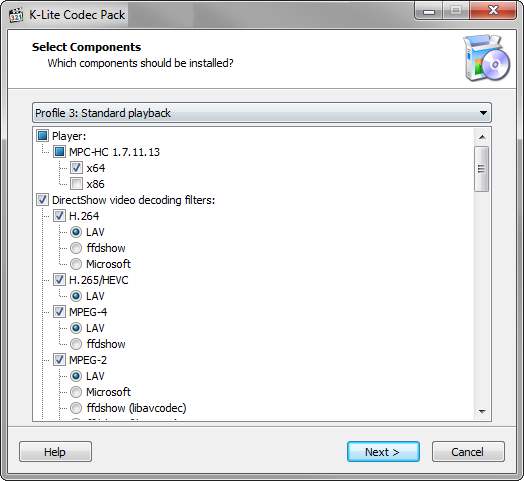 K-Lite Codec Pack скачать бесплатно K-Lite Codec Pack – бесплатный пакет декодеров для качественного воспроизведения видеокомпозиций и музыки проигрывателем компьютера. Воспроизводит всем знакомые форматы и «проблемные», находит и меняет поврежденные декодеры и фильтры, а также постоянно обновляет свою базу актуальными кодеками. Данная утилита будет актуальна в случае, если ваш проигрыватель не может открыть какой-то сложный или «проблемный» формат мультимедиа (MOV, MP4, FLV, 3GP, MPEG, MKV). Чтобы стать обладателем плеера, которому под силу любые аудио- и видеокомпозиции, нужно просто скачать бесплатно K-Lite Codec Pack на компьютер. Помимо декодеров, в пакет включены инструментарии и фильтры DirectShow, а также проигрыватели Media Player Homecinema и Media Player Classic. Софт способен распознать и удалить «поломанный» фильтр, а также частично или полноценно (без следов) очистить от кодеков. Разработчиками созданы четыре варианта проигрывателя Кей-Лайт Кодек Пак: Standa