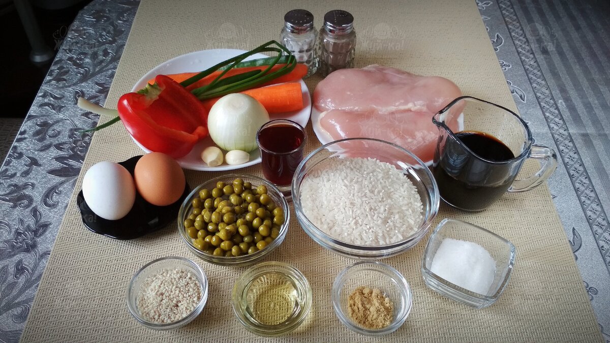 Не знаете как удивить гостей или что придумать на обед для домочадцев? Есть идея! Готовим вкусное и сытное блюдо! Ингредиенты: · Куриное филе – 500 грамм · Рис длиннозёрный - 1 стакан · Яйца - 2 штуки · Морковь - 2 небольшие штуки · Перец сладкий красный - ½ штуки · Зелёный горошек консервированный - ½ стакана · Лук - 1 штука · Чеснок - 2 зубчика · Имбирь молотый - 1 чайная ложка · Кунжут - 1 столовая ложка · Растительное масло - 3 столовые ложки · Соевый соус - ½ стакана · Вино красное полусладкое - ¼ стакана (не обязательно) · Сахар - 1 столовая ложка (не обязательно) · Соль, перец, зелень – по вкусу Способ приготовления: Сначала готовим маринад для курицы. Для этого смешиваем соевый соус, вино и сахар. Предупреждаю, что вкус у блюда будет сладковатый. Так что, если не хотите этого, то вино и сахар можете исключить. Так тоже будет очень вкусно! Проверено! Филе курицы промываем