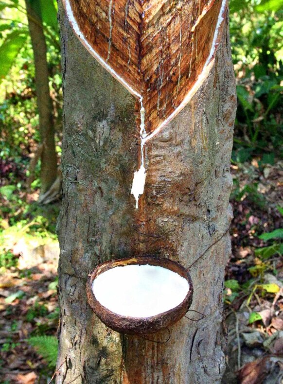 Первоначально, добывается сок дерева Гевеи (каучукового дерева). В стволе растения делается заруб, через который в специальные чаны истекает белое молоко, сок дерева Гевея. Процесс добычи сока достаточно длительный.