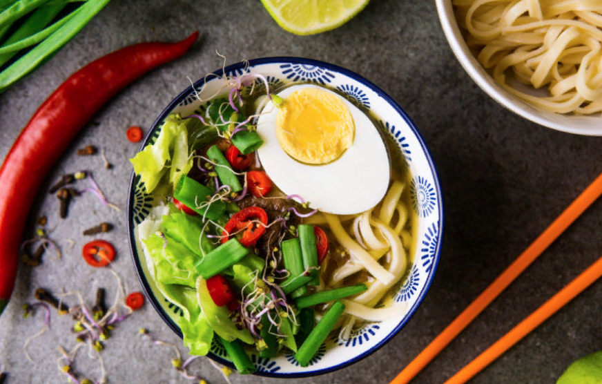Японский суп самураев, который сразу поставит вас на ноги. Это блюдо называется рамэн,с большим количеством цветных, хрустящих овощей, лапшой и яйцом. Основой которого является куриный бульон.
