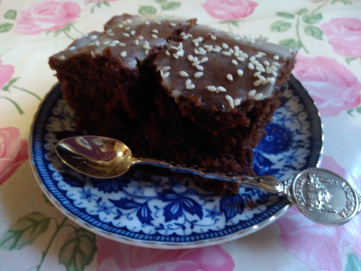 А еще мы готовый, еще горячий кекс пропитаем сметанным кремом и украсим кунжутом.