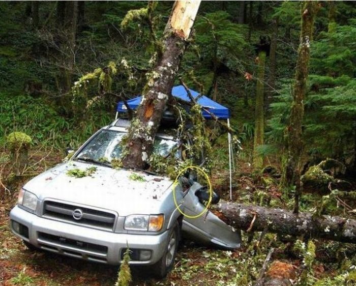 Парень приехал в лес, чтобы немного отдохнуть. Стоило ему только припарковаться, и сесть на порог автомобиля с баночкой пива, как на машину тут же упало старое дерево, не выдержавшее порыва ветра. К счастью, серьезно он не пострадал.